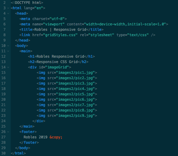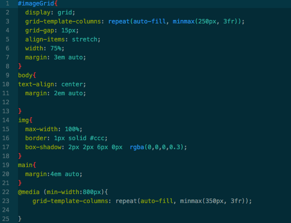 CSS code that creates and displays the responsive photo grid with media query settings.